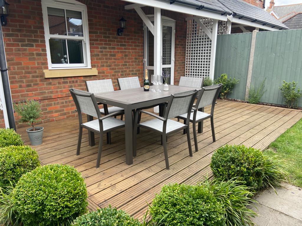 Garden: Small enclosed garden with decking area and lawn, outdoor furniture to seat 6 and summer house providing secure bike storage.