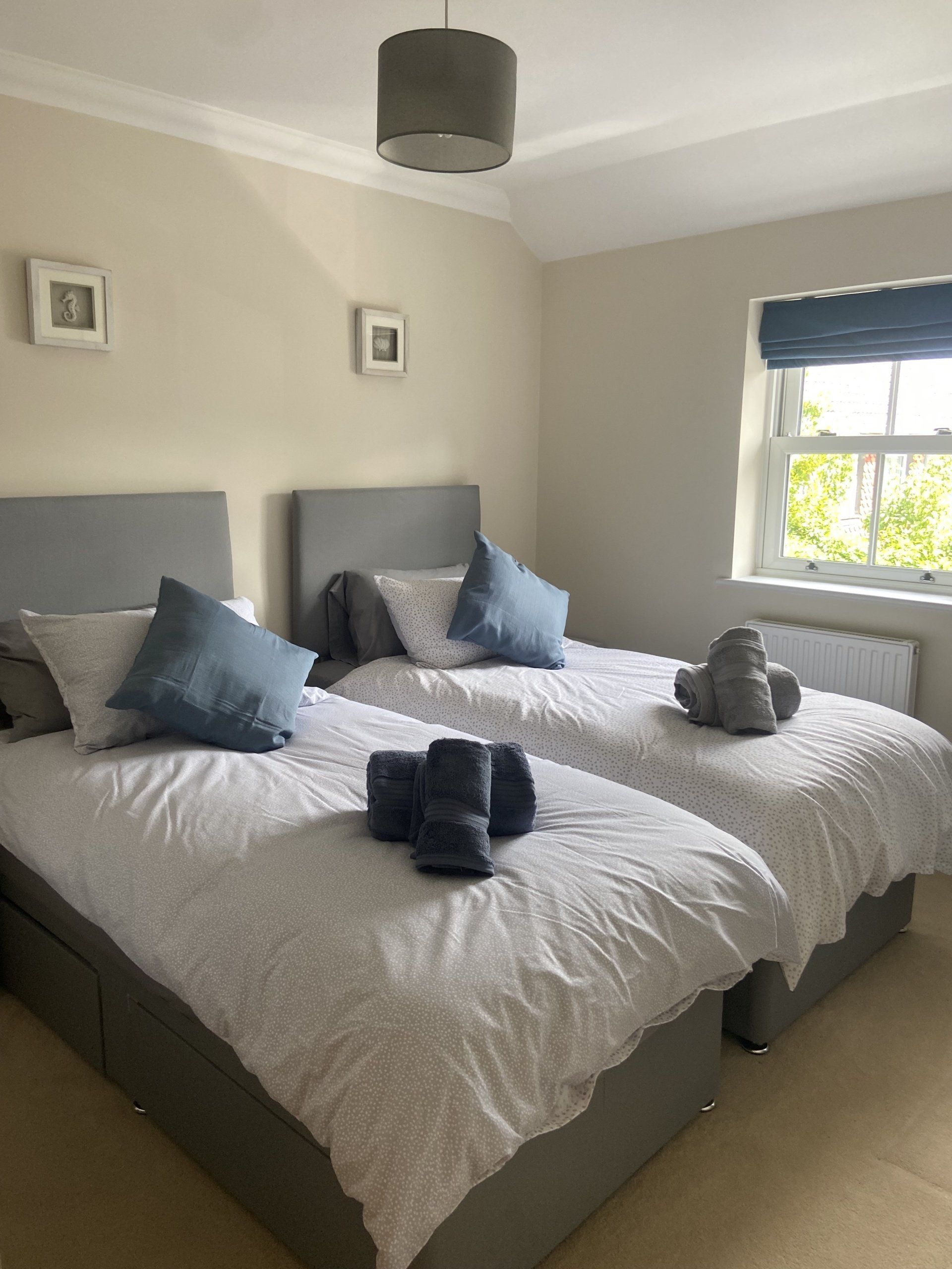 Bedroom 2: Twin beds, wardrobe, chest of drawers, clock radio with USB/wireless charger and roman blind with blackout lining.